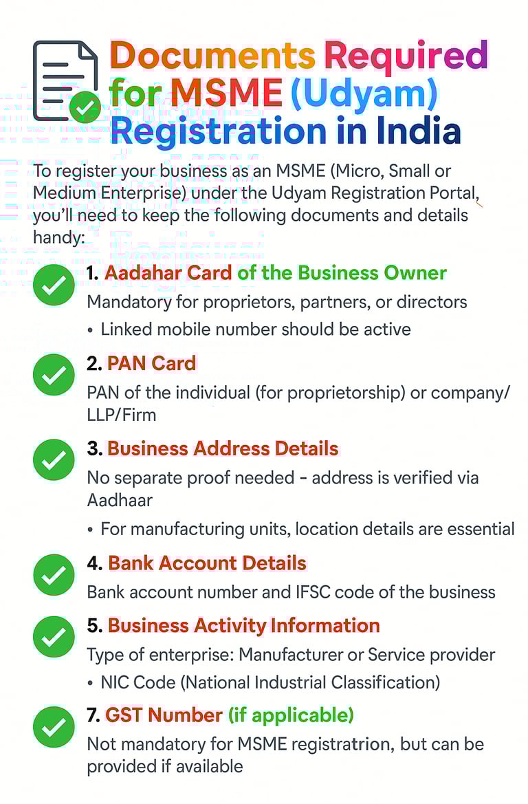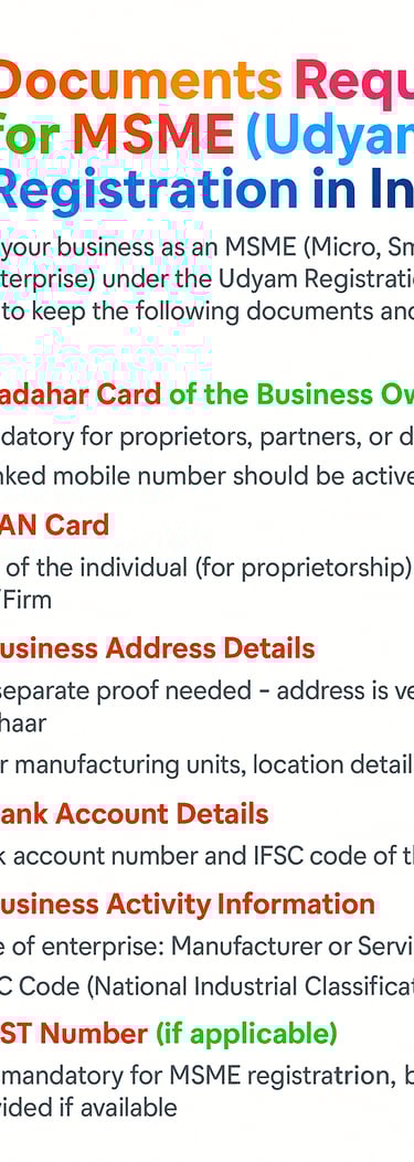 For registering your business as an MSME (Micro, Small or Medium Enterprise) on the Udyam Registration Portal, keep the following documents and information ready: