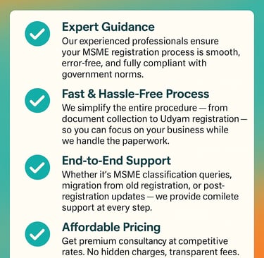 Whether it's MSME classification questions, conversion from legacy registration, or post-registration changes β we offer end-to-end support at each step.