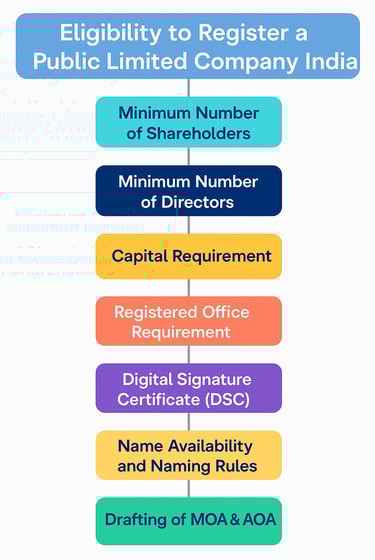In order to include an public limited company in India, the following legal, personal, and procedural eligibility criteria mentioned in the Companies Act, 2013 and Ministry of Corporate Affairs (MCA) rules have to be met by the applicant: