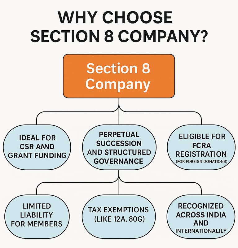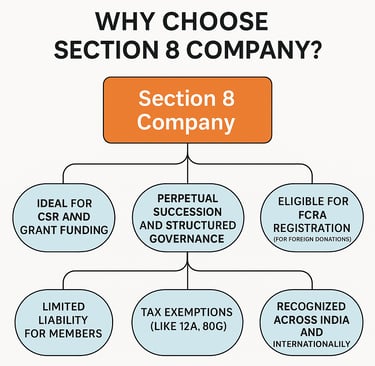In contrast to Trusts or Societies, a Section 8 Company is facilitated with stringent compliance regulations, formal governance, limited liability, and legal identity under the Companies Act โ and hence, it is more secure for institutional finance and mass-level operations.