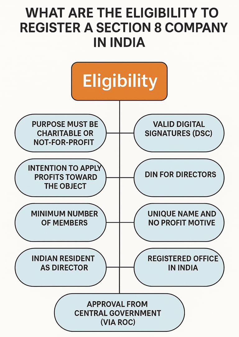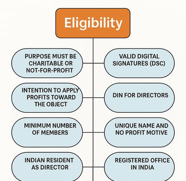 In order to include an Section 8 company in India, the following legal, personal, and procedural eligibility criteria mentioned in the Companies Act, 2013 and Ministry of Corporate Affairs (MCA) rules have to be met by the applicant: